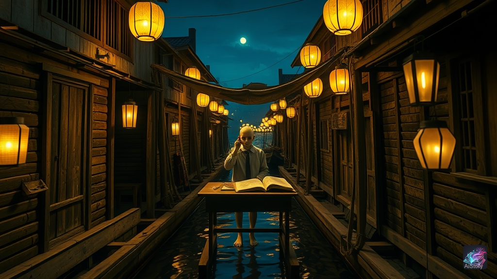 พวกเขาตัดสินใจเดินทางกลับ แต่ทางเดินกลับถูกบล็อกด้วยเรือลอยน้ำที่จอดนิ่งสงบนิ่ง พลอยสั่นเครือเมื่อพูดว่า "มันผิดแปลกๆ พวกเราไม่ควรอยู่ตรงนี้" มอสพยายาม [แสดงออก] ว่ากล้าหาญ แต่มือกลับสั่นไม่หยุด แล้วเสียงกระซิบก็ดังมาจากแผงขายใกล้ที่สุดว่า "เธอทิ้ง [สูตรคำนวณ] ไว้" ทั้งสองหันไป ไม่มีใครอยู่เลย แต่บนพื้นก็มีสมุดจดเล่มหนึ่ง หน้ากระดาษเหลืองคล้ำ พร้อมชื่อพวกเขาถูกเขียนด้วยหมึกแดง สมุดเล่มนั้นเต็มไปด้วยคำตอบ ทุกข้อตรงกับที่พวกเขาทำไว้ มอสเข้าใจทันทีว่านี่ไม่ใช่ผีธรรมดา นี่คือใครบางคนที่เคยเป็น [ศัตรู] ของพวกเขามาแล้ว คนที่เคย [โกง] สอบทุกครั้ง ตอนนี้วิญญาณนั้นต้องการค่าตอบแทนในรูปของความหวาดกลัว กฎ [หลัก] ของตลาดน้ำคือ ห้ามอยู่หลังเที่ยงคืน และตอนนี้พวกเขาเกินกำหนดไปแล้ว